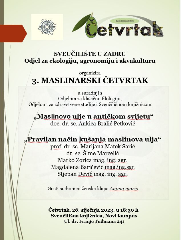 Odjel za ekologiju, agronomiju i akvakulturu organizirao je u suradnji s Odjelom za klasičnu filologiju, Odjelom za zdravstvene studije i Sveučilišnom knjižnicom 26. siječnja 2023. u Sveučilišnoj knjižnici na Novom kampusu Treći maslinarski četvrtak. Predavanje je bilo namijenjeno svima koji žele doznati više o počecima proizvodnje i korištenja maslinova ulja te naučiti kako se provodi njegovo senzorsko ocjenjivanje.