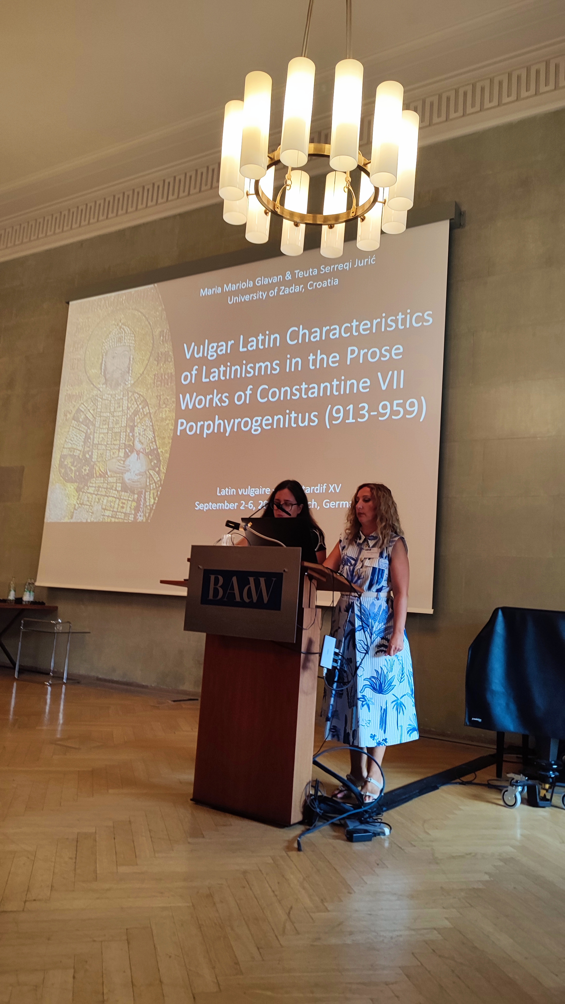 Izv. prof. dr. sc. Teuta Serreqi Jurić i doc. dr. sc. Maria Mariola Glavan sudjelovale su na međunarodnoj znanstvenoj konferenciji Latin vulgaire - latin tardif XV, Munchen, 2.-6. rujna 2024., u organizaciji Bavarske akademije znanosti i umjetnosti, koja je okupila najuglednije svjetske znanstvenike koji se bave kasnim i vulgarnim latinitetom. U izlaganju "Vulgar Latin Characteristics of Latinisms in the Prose Works of Constantine VII Porphyrogenitus (913.-959) predstavljeni su rezultati istraživanja oko 400 latinizama u Porfirogenetovim najvećim proznim djelima koji su po prvi put sustavno obrađeni. Istraživanje predstavlja iznimno vrijedan doprinos za proučavanje Porfirogenetova opusa i bizantskog grčkog jezika, a provedeno je u sklopu institucionalnog projekta "Digitalizacija izvora za poznavanje ranosrednjovjekovne hrvatske povijesti I: Konstantin Porfirogenet, De administrando imperio" (IP.01.2023.19) na Sveučilištu u Zadru.