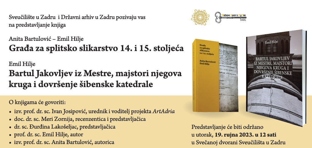 Sveučilište u Zadru i Državni arhiv u Zadru pozivaju vas na predstavljanje knjiga Građa za splitsko slikarstvo 14. i 15. stoljeća autora Anite Bartulović i Emila Hilje te Bartul Jakovljev iz Mestre, majstori njegova kruga i dovršenje šibenske katedrale autora Emila Hilje.